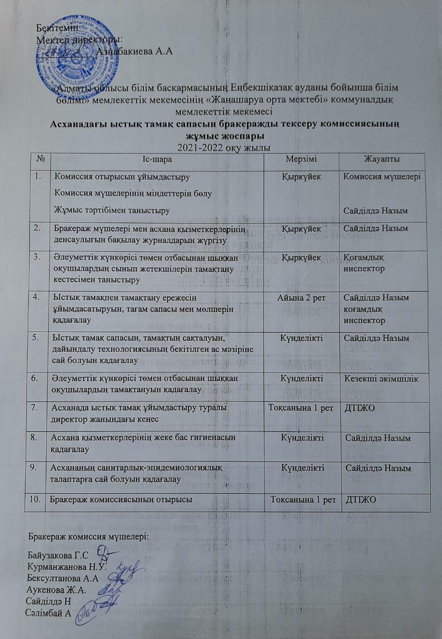 01 сентябрь 2021 0 1 2 3 4 5 Асханадағы ыстық тамақ сапасын бракеражды тексеру комиссиясының жұмыс жоспары