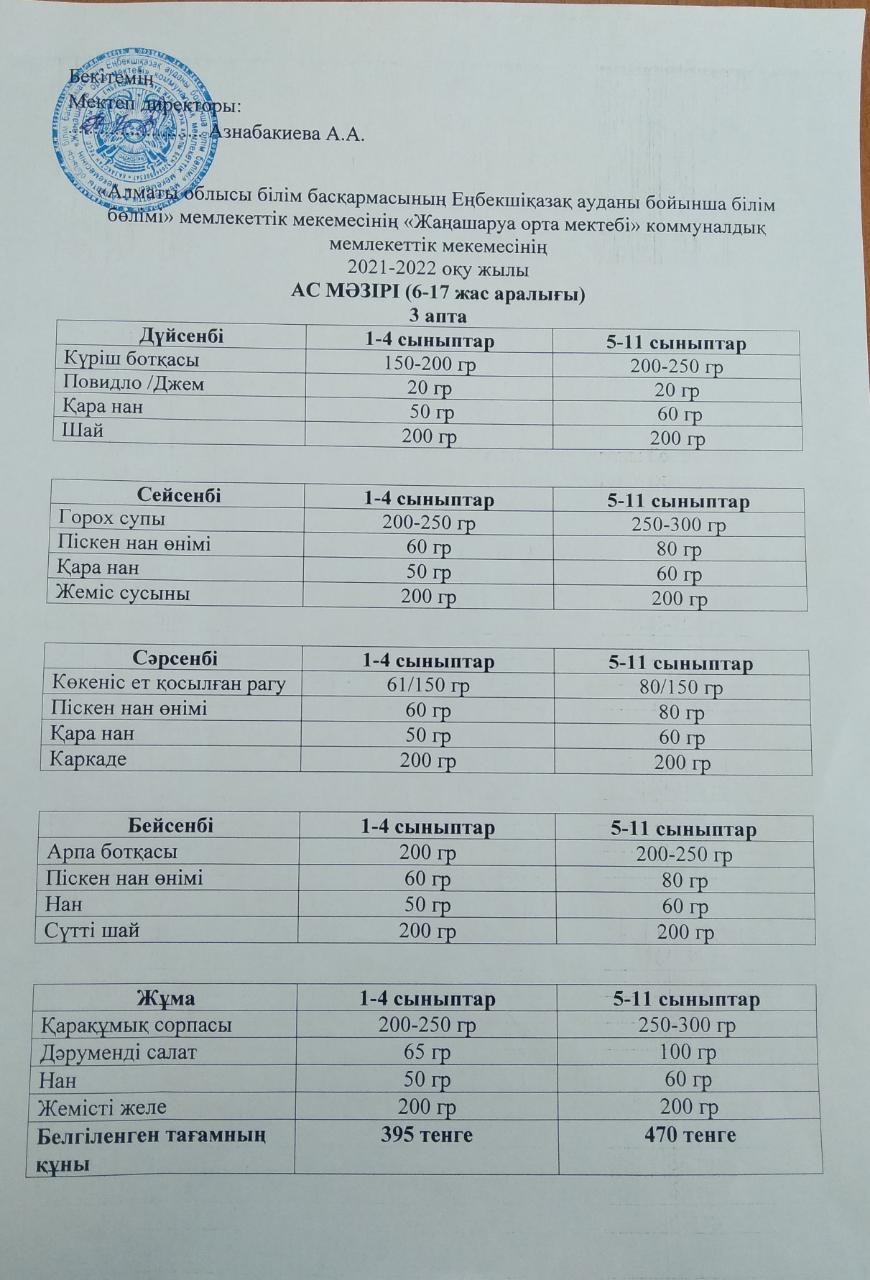 Мектеп асханасының ас мәзірі. 3-апта » Жаңашаруа орта мектебі