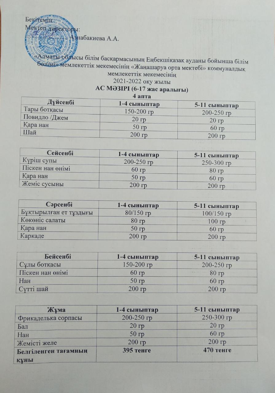 Мектеп асханасының ас мәзірі. 4 апта » Жаңашаруа орта мектебі