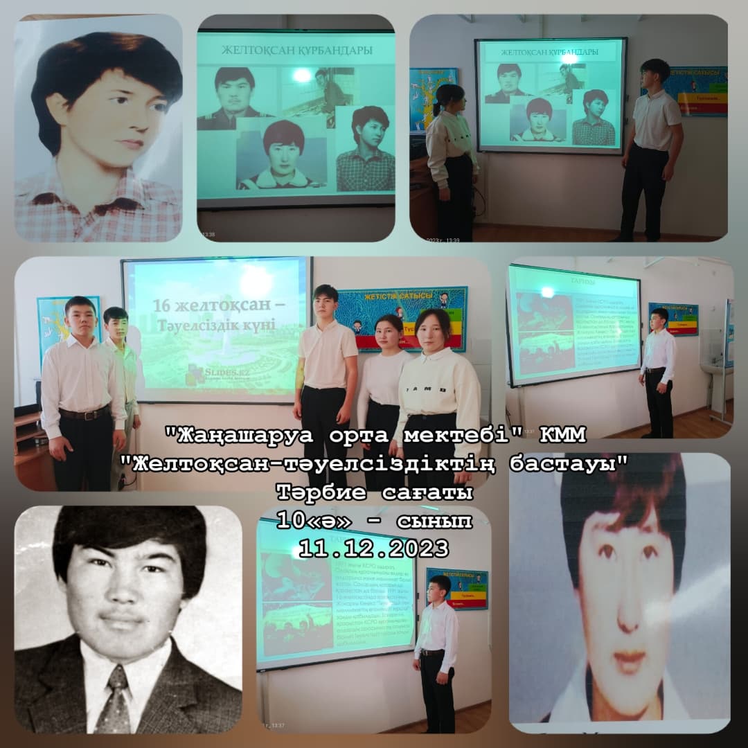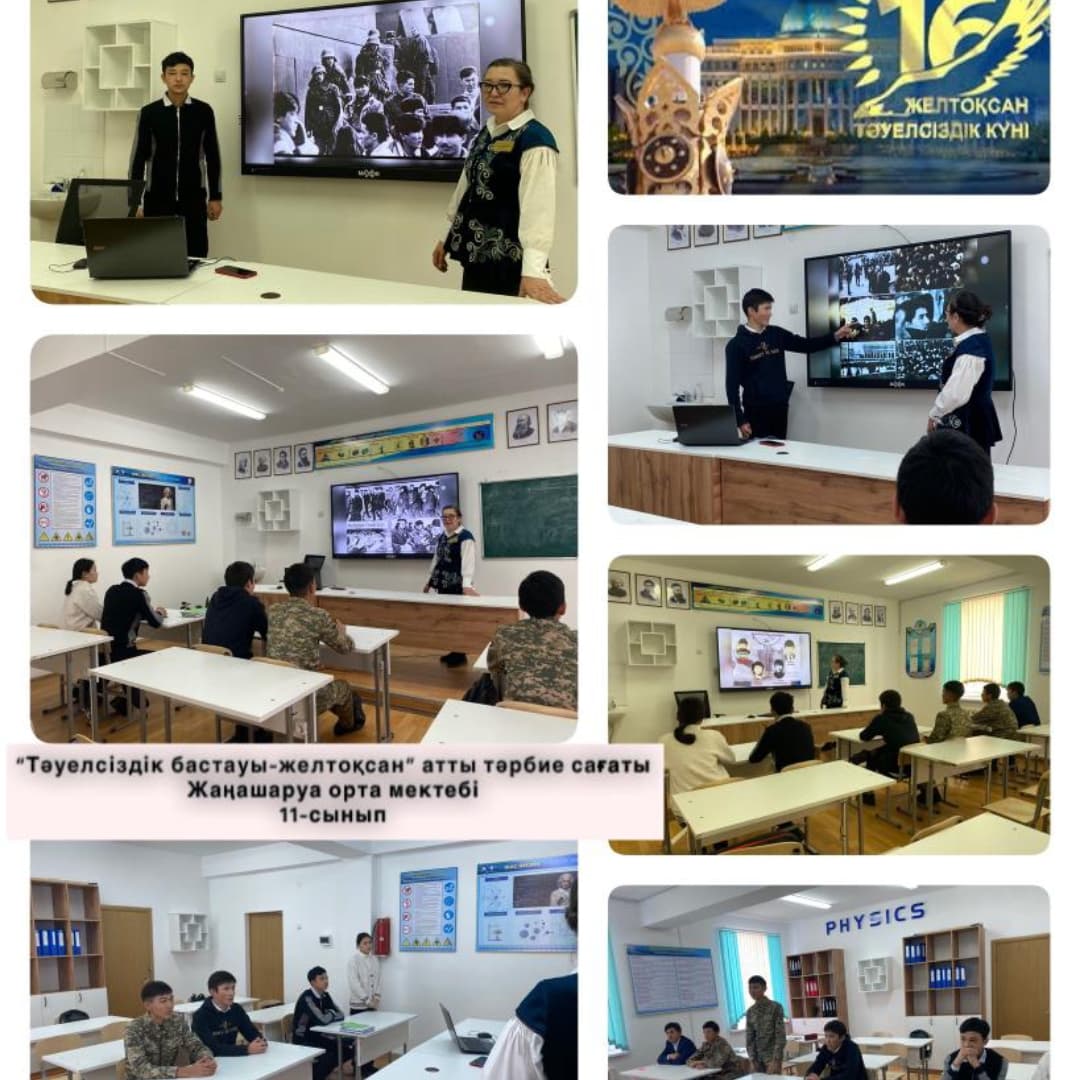 Тәуелсіздік- ел мұраты. Бұл біздің ұлан байтақ теңіздей Қазақ тарихының басынан кешкендерінің тамшысы ғана болса да, осы 37 жылда Қазақстанның дамып өркендеуін жылдармен өрнектейміз.Осыған орай мектебімізде 16 желтоқсан Тәуелсіздік күніне арналған 1-11 сыныптар аралығында сынып сағаттары өтті.