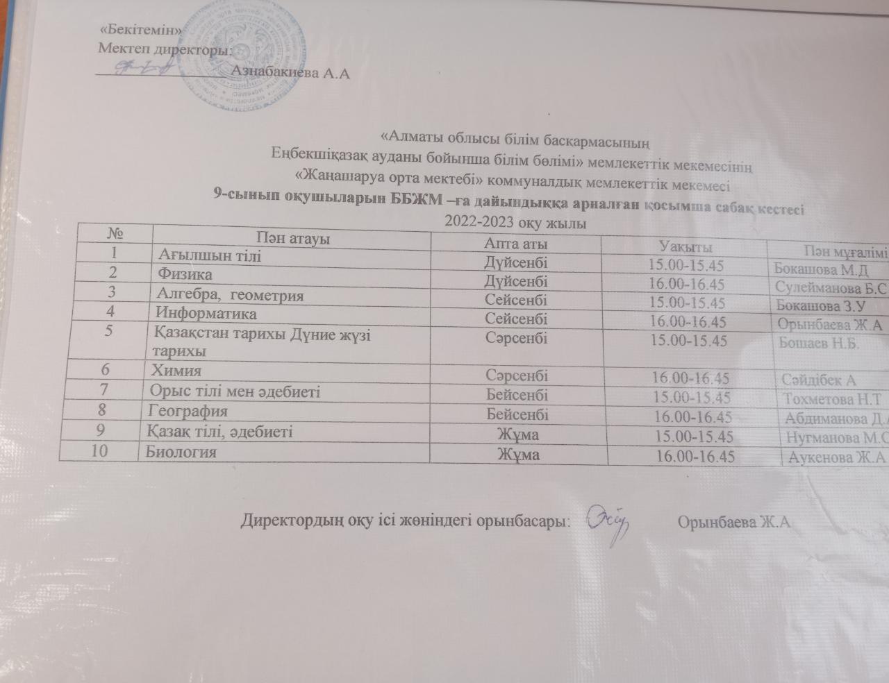 05 сентябрь 2022 0 1 2 3 4 5 2022-2023 оқу жылы 9-сынып оқушыларын ББЖМ-ға дайындыққа арналған сабақ кестесі
